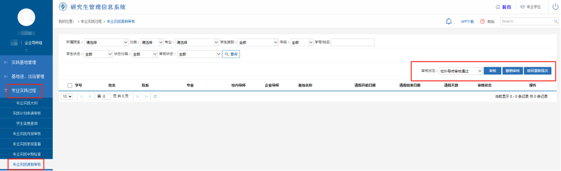 在【专业实践奖学金】—【专业实践奖学金审核】模块下审核学生在站情况;为把握学生实际在站情况,请企业导师按照实际情况审核。